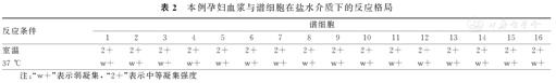 本例孕妇血浆与谱细胞反应格局显示,室温条件下呈现多凝集状态,凝集强度均为2+;37 ℃条件下均为弱凝集。室温条件下,本例孕妇血浆与A2细胞反应的凝集强度为2+,但是不与O型和B型脐带血红细胞反应(表1),符合抗-HI的特异性反应格局,表明抗体为宽热振幅抗-HI。本例孕妇血浆与谱细胞在盐水介质下的反应格局,见表2。