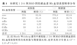 注:经Hardy-Weinberg遗传平衡检验,1 244例RhD阴性献血者的Rh血型表型频率的观察值与期望值比较,差异无统计学意义(χ2=2.17,P>0.05)