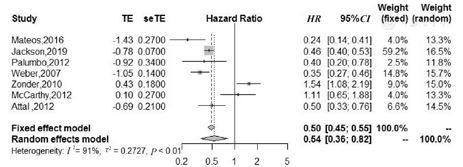 | 纳入文献(第一作者,文献发表年) | HR | 95%CI | P值 | τ2 | I2 |