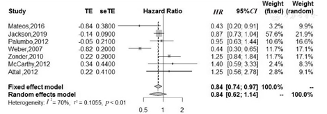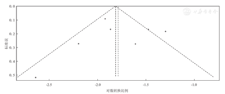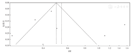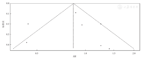 本研究纳入7项RCT研究均对MM患者的3年OS期进行分析,其异质性检验结果显示,各研究间存在异质性(P<0.01,I2=70%),使用随机效应模型评价。与对照组相比,研究组患者的3年OS期显著延长(HR=0.84,95%CI:0.62~1.14,P=0.262)。接受来那度胺与安慰剂/地塞米松治疗的MM患者的3年OS期比较的Meta分析,见图4。这7项RCT研究组和对照组3年OS期比较的发表偏倚检测结果显示,漏斗图基本对称(图5)