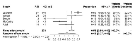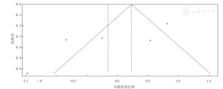 纳入的7项RCT中,有5项RCT报道感染部位。研究组严重感染患者为278例,其中呼吸道严重感染者为155例。异质性检验结果显示,各研究间存在异质性(P<0.01,I2=89%),选用随机效应模型进行Meta分析。通过对5项RCT数据汇总结果显示,接受来那度胺治疗后发生严重感染的MM患者中,呼吸道严重感染发生率为46%(95%CI:27%~65%)。来那度胺治疗相关呼吸道严重感染发生率的Meta分析,见图8。5项RCT的发表偏倚检测结果显示,漏斗图散点分布不对称(图9)。进一步对该组数据行敏感性分析结果示,排除任何一个研究结果,呼吸道严重感染发生率波动于40.6%~55.1%,与排除前相似,因此本组数据仍视为可靠。