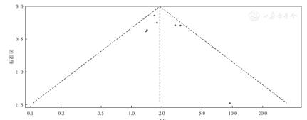 7项RCT研究均报告来那度胺治疗相关严重感染。异质性检测结果显示,纳入研究间无异质性(P=0.293,I2=17.9%),故采用固定效应模型进行Meta分析。与对照组相比,研究组来那度胺治疗MM患者相关严重感染的发生风险显著增加(RR=1.92,95%CI:1.59~2.33,P<0.000 1)。来那度胺治疗MM患者严重感染RR的Meta分析,见图10。7项RCT研究组和对照组严重感染RR比较的发表偏倚检测结果显示,漏斗图基本对称(图11)。
