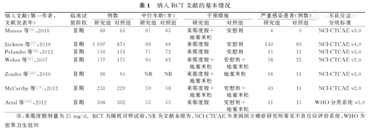 | Weber等[9],2007 | Ⅲ期 | 177 | 175 | 64 | 62 | 来那度胺+地塞米松 | 安慰剂+地塞米松 | 38 | 21 | NCI-CTCAE v2.0 |