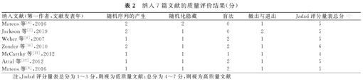 根据Jadad评分量表评分标准,对纳入的7篇文献[6,7,8,9,10,11,12]进行质量评价的结果显示,Jadad量表评分总分系6分文献为1篇,5分文献为5篇,4分文献为1篇。上述文献均为高质量文献。纳入文献的质量评价结果,见表2。