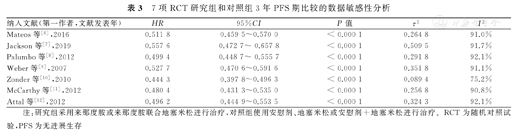 7项RCT研究组和对照组3年PFS期比较的数据敏感性分析