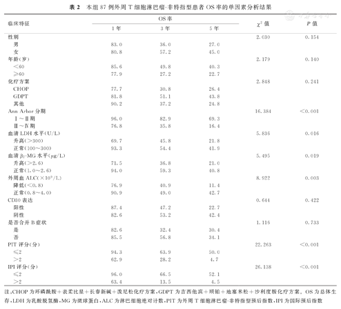本组87例外周T细胞淋巴瘤-非特指型患者OS率的单因素分析结果