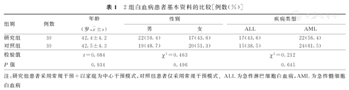 选择2017年1月至12月于南京医科大学第一附属医院血液科住院治疗的78例白血病患者为研究对象。患者年龄为(42.4±4.2)岁,年龄范围为19~57岁;男性患者为41例,女性为37例。研究对象纳入标准:①符合法国-美国-英国协作组(France America Britain,FAB)白血病诊断标准[7,8]者;②病例资料完整者;③接受白血病全程治疗,并且预计生存期>6个月者;④精神状态正常,能理解本研究所用量表内容者;⑤自愿参与本项研究者。排除标准:①合并交流障碍,或抑郁症、焦虑症等精神类疾病者;②中途退出本研究者;③合并免疫功能障碍者;④既往有精神类药物使用史者。采用随机数字表法,将研究对象分为研究组(n=39,常规干预模式+以家庭为中心干预模式)和对照组(n=39,常规干预模式)。2组患者的年龄、性别、疾病分型等基本资料分别比较,差异均无统计学意义(P>0.05),见表1。本研究遵循本院伦理委员会所制定的伦理学标准,并得到批准(批准文号:WDL201700112),所有患者签署临床研究知情同意书。