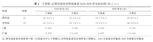 干预前,研究组和对照组患者的SAS、SDS评分分别比较,差异均无统计学意义(t=0.299、P=0.766,t=0.042、P=0.967)。干预后,研究组患者的SAS、SDS评分显著低于对照组,并且差异均有统计学意义(t=7.945、P<0.001,t=7.565、P<0.001)。干预前、后研究组和对照组患者心理状态的比较,见表2。