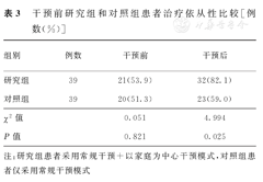 干预前,研究组和对照组患者的治疗依从率比较,差异无统计学意义(χ2=0.051,P=0.821)。干预后,研究组患者的治疗依从率显著高于对照组,并且差异有统计学意义(χ2=4.994,P=0.025)。干预前、后研究组和对照组患者治疗依从率的比较,见表3。