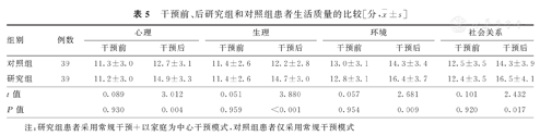 干预前,研究组和对照组患者生活质量中,心理、生理、环境、社会关系维度的评分分别比较,差异均无统计学意义(t=0.089、P=0.930,t=0.051、P=0.959,t=0.057、P=0.954,t=0.101、P=0.920),干预后,研究组患者的心理、生理、环境及社会关系各维度评分分别显著高于对照组,并且差异均有统计学意义(t=3.012、P=0.004,t=3.880、P<0.001,t=2.681、P=0.009,t=2.432、P=0.017)。干预前、后2组患者生活质量的比较,见表5。