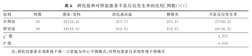 研究组不良反应发生率为29.2%(27/39),显著低于对照组的46.2%(18/39),并且差异有统计学意义(χ2=4.255,P=0.039)。研究组和对照组患者不良反应发生率的比较,见表6。