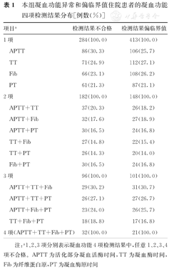 本研究对患者凝血功能异常的判断标准为:任何一项凝血功能检测结果超出正常参考值,即判定为凝血功能异常。凝血功能检测结果的正常参考值如下,Fib值为2.0~4.0 g/L,PT为9.2~15.0 s,TT为10~20 s,APTT为21.0~37.0 s[3]。凝血功能偏临界值的判断标准为:任何一项凝血功能检测结果在正常参考值内,并接近于正常参考值的上、下限者,即Fib值为2.0~2.2 g/L或3.8~4.0 g/L,PT为9.2~9.6 s或14.6~15.0 s,TT为10.0~10.2 s或19.8~20.0 s,APTT为21.0~23.0 s或35.0~37.0 s。
