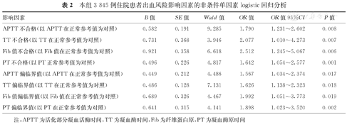 选择2019年6月至2020年5月,于四川省江油市第二人民医院住院的3 845例接受凝血功能检测的患者为研究对象。患者年龄为(38.4±5.6)岁;男性患者为1 943例,女性为1 902例。采用回顾性研究方法,收集所有患者凝血功能检测结果,包括凝血酶原时间(PT)、凝血酶时间(TT)、活化部分凝血活酶时间(APTT)及纤维蛋白原(Fib)值,以及住院期间的异常出血情况。采用单因素非条件logistic回归法对住院患者出血风险的影响因素进行分析。本研究遵循的程序符合2013年修订版《世界医学协会赫尔辛基宣言》要求,并且与所有受试者签署临床研究知情同意书。
