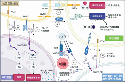 CD160分子通过磷酸肌醇-3激酶(phosphoinositide-3 kinase,PI3K)诱导NK细胞中蛋白激酶B(protein kinases B, PKB,又被称为Akt)磷酸化和下游相关激酶产生促生存信号。同时CD160有助于增强CD3分子诱导的细胞杀伤力及CD8+ T细胞的增殖[2,6]。有文献报道,在CD8+ T细胞中,仅有表达CD160的细胞具有细胞毒活性[1]。