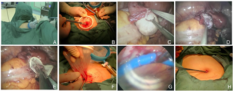 注:A.置入软质Triport套管建立手术通道;B.放置软质Triport套管后脐部切口大小;C.显露卵巢畸胎瘤;D.用3-0倒刺线缝合卵巢创面;E.剥出卵巢畸胎瘤后用无菌手套自制标本袋自脐孔取出标本;F.在5 mm腹腔镜镜头引导下取出软质Triport套管;G.在5 mm腹腔镜镜头引导下血管钳钳夹Triport套管取出套管;H.脐孔成形后脐轮形态未破且切口微小、隐匿、美观