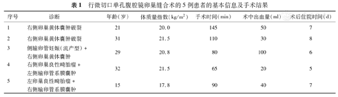 行微切口单孔腹腔镜卵巢缝合术的5例患者的基本信息及手术结果