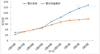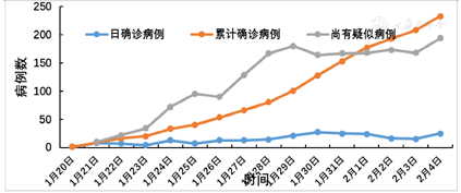 本市自1月20日确诊第一病例以来,每日新增确诊的病例数逐渐增加,至1月30日增到最高为27例,此后有下降的趋势,后4天确诊的病例数分别为25例、24例、16和15例;尚有疑似病例从1月21日的20例逐渐增加到1月29日的180例,此后有下降的趋势;累计确诊病例从1月20日的1例逐渐增加到2月3日的208例。见图1。