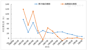 尚有疑似病例环比增长率在1月27日之前处于波动阶段,此后处于下降趋势阶段。累计确诊病例环比增长率在1月25日之前处于波动阶段,此后处于下降阶段。见图2。