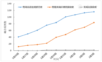 在确诊病例中,有相关确诊病例接触史的一直少于有湖北居住或旅行史的,有湖北居住或旅行史的确诊病例累计占55.77%。直到1月29日才出现2例无湖北接触史,此后保持不变。见图4。