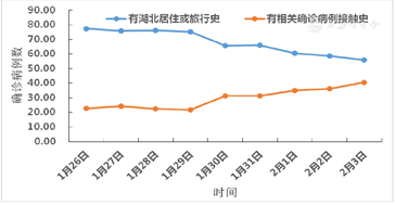 在1月26日至1月29日之间,确诊病例中有湖北居住或旅行史的比例和有相关确诊病例接触史的比例保持稳定,此后有湖北居住或旅行史的比例呈下降趋势,而有相关确诊病例接触史的比例呈上升趋势。见图5。