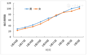 除了1月31日,确诊新型冠状病毒肺炎病例女性多于男性,其他都是男性多于女性,但二者比较接近,男女性别比为1∶1.06。见图6。