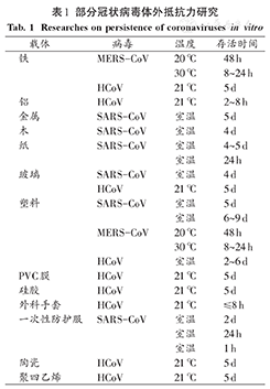 2004年,一项针对严重急性呼吸综合征(severe acute respiratory syndrome,SARS)冠状病毒抵抗力的研究[21]发现,该病毒在体外环境中的存活情况随温度而异,20 ℃避光条件下在医院污水、生活污水和脱氯自来水中只能存活2 d,在粪便中可以存活3 d,在生理盐水中可以存活14 d,在尿液中可以存活17 d;4 ℃情况下,该病毒在上述各种水体中均可存活14 d以上,在粪尿中可以存活17 d以上。有关Hendra病毒的抵抗力研究[22]表明,Hendra病毒可感染人和马引起急性呼吸系统疾病,其冬天存活能力强于夏天,病毒存活受环境温度影响较大。在1例MERS-CoV感染死亡案报道[23]中,患者死亡3 d后仍在鼻腔分泌物中检出了MERS-CoV。2020年1月27日,中国疾病预防控制中心在华南海鲜市场环境中检测出大量新冠病毒,表明新冠病毒在寒冷的环境下也具有很强的抵抗力,至少存活数天以上。表1是新近一项针对冠状病毒在不同载体、环境温度下抵抗力的研究数据[24],供大家参考。