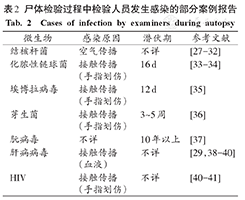 根据国内外相关文献的报道,因参与、观摩或学习传染病尸体解剖而导致感染的案例时有发生(表2)。NOLTE等[25]报道,在传染病死者的尸体解剖中,操作人员感染病原体的可能性极高,如碎骨、解剖器械、针头等锐利物品会刺破手套划伤皮肤等,导致感染的发生。既往有因轻微皮肤损伤而导致链球菌感染死亡的案例,以及通过死者血液感染乙肝病毒的案例。BROOKS等[26]指出,在对脑膜炎球菌感染患者解剖时,可能会导致操作人员感染脑膜炎球菌,原因可能是尸体检验过程中产生了气溶胶,而普通医用口罩无法隔绝这种微粒而被吸入,故遇到此类情况时应使用N95及以上级别的防护口罩。因此,再次提醒法医病理学工作人员,在传染病死者的尸体检验工作中必须严格做好防护措施。