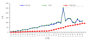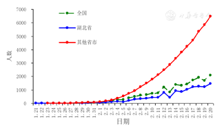 按照全国范围(包括内地和港澳台地区)、湖北省以及省外其他地区,收集每日新增/累计确诊人数、新增/累计治愈人数、新增/累计死亡人数等基础数据,在此基础上计算病死率、累计治愈与累计死亡之比、每日新增确诊人数的变化及比例等指标。每日新增确诊人数的变化及比例计算如下:假设当日累计确诊人数为a,前一日累计确诊人数为b,则当日新增确诊人数为c=a-b。假设当日新增确诊人数为c1,前一日新增确诊人数为c2,则当日新增确诊人数的变化为△c=c1-c2,每日新增确诊人数的变化比例即为△c/c2。所有数据均采用Microsoft Office 2013(Excel 2013)进行计算,并绘制成线图或条图。