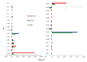 在每日新增确诊病例的基础上,计算每日新增确诊病例人数的变化人数占前一天新增确诊人数的百分比,结果见图4所示。如果当日新增确诊人数较前一日增加,则每日新增确诊病例人数的变化人数是正值,每日新增确诊病例人数的变化比例也为正值;如果当日新增确诊人数较前一日较少,则每日新增确诊病例人数的变化人数是负值,每日新增确诊病例人数的变化比例也为负值。由此可见,该指标为负值且数值较大时,表明当日新增确诊人数是下降的且下降幅度较大;该指标若为正值且数值较大时,表明当日新增确诊人数是上升的且上升幅度较大。从图3可以看出无论是全国、湖北省及省外其他地区的数据,在2月5日之前,每日新增确诊人数以增加为主,1月27日增幅最高,全国数据达到126%(湖北省数据达到248%)。湖北省外其它地区由于每日确诊人数的基数小,使得疫情初期该增幅比例异常升高(1月21日达到780%)。2月5日之后,全国及湖北省数据显示除了2月12日的异常波动外,每日新增确诊人数以降低为主,15天之内的10天均为新增确诊人数降低,2月19日降幅最高,全国达到77%(湖北省数据达到79%)。湖北省外其它地区15天内有13天均显示新增确诊人数的下降。