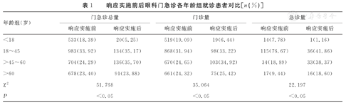 响应实施前后眼科门急诊各年龄组就诊患者对比[n(%)]