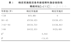 响应实施后,眼科门急诊就诊例数均大幅减少,门急诊总量从2 898例降至381例,降幅为86.85%,门诊总量从2 718例降至295例,降幅为89.15%,急诊总量从180例降至86例,降幅为52.22%。