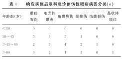| 年龄组(岁) | 眼睑裂伤 | 电光性眼炎 | 角膜烧伤 | 眼挫伤 | 结膜裂伤 | 晶状体脱位 |