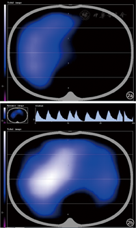 有研究试图确定使用这些气道廓清技术是否可以改善患者氧合、呼吸力学、肺功能,并减少机械通气时间、ICU住院时间、再入院或急诊次数、感染频率,提高生活质量等。一项儿科受试者的回顾性队列研究[96]评估了烧伤患者采用机械通气治疗时肝素和NAC的使用效果,结果表明,5000 U雾化肝素与3 ml 20% NAC交替使用,在最初的7 d内可减少小儿烧伤患者再次插管、呼吸机使用时间和死亡率。通过影像学变化也可判断治疗的效果,如气管镜吸痰治疗前后肺不张的改善情况(图1)。电阻抗断层成像(electrical impedance tomography,EIT)是以生物电阻为基础的功能成像技术,胸EIT借助微电压在胸内气体产生微电流,积分测算肺内气体随呼吸电阻值变化动态、立体成像,可以在气道廓清治疗过程中及前后比较治疗效果(图2)。