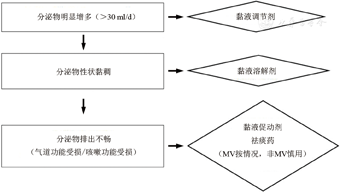 慢性气道疾病,如慢性阻塞性肺疾病、哮喘、弥漫性泛细支气管炎、支气管扩张、囊性纤维化等均与慢性炎症有关[14]。此类疾病具有气道黏液高分泌的特点[15],大量黏液蓄积在气道管腔中,导致气道阻塞、气流受限,加速肺功能的下降。同时,炎症反应可降低纤毛清除功能、损伤肺泡表面活性物质和改变黏液性质,导致气道的反复感染、阻塞和重塑,形成恶性循环。人工气道的建立也会损伤黏液清除系统[16,17,18,19,20],是重症患者发生气道廓清障碍的另一原因。