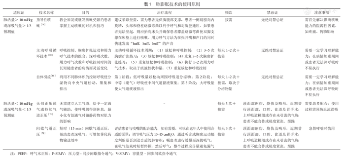 | 肺活量>10 ml/kg或深吸气量>1/3预测值 | 指导性咳嗽[79] | 教会原发或继发咳嗽受限的患者掌握主动咳嗽的时机和技巧 | 建议采取坐姿,需为患者提供胸腹部支撑,患者一侧肩膀向内旋转,头部和脊柱略微弯曲以利于呼气和对胸腔施压。如果患者无法坐起,则应抬高床头并确保患者膝盖略微弯曲使双脚支撑在床垫上进行咳嗽。用力呼气方法为在张开嘴和声门的同时快速发出"huff,huff,huff"的声音 | 按需 | 无绝对禁忌证 | 需首先解决影响咳嗽能力的医源性因素,如疼痛、药物影响 |