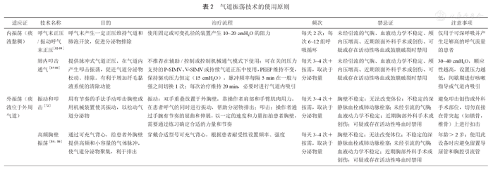 | 外振荡(痰液位于外周气道) | 振动和叩击[72] | 用有节奏的手法手动叩击胸壁或用机械装置使其振动,以松动气道分泌物 | 振动:双手重叠放置于外胸壁,靠操作者肩部和手臂肌肉用力,在患者呼气的同时进行振动,帮助分泌物排出;叩击:操作者通过手腕有节奏的屈曲和伸展,以一定的速度和力量扣拍患者胸壁,需要通过练习确定合适的力量和节奏 | 每天3~4次+按需,取决于分泌物量 | 胸壁不稳定;无法改变体位;不稳定的深静脉血栓或肺动脉栓塞;未经引流的气胸;血液动力学不稳定;近期胸部外科手术或创伤;可疑或存在活动性咯血时禁用 | 避免叩击创伤或外科手术部位,切勿直接在骨突起(如锁骨,椎骨)上进行扣击 |