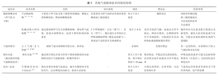 对患者实施气道廓清治疗前均需进行呼吸功能和排痰障碍原因的评估,以制定个体化的气道廓清方案[68,69,70,71,72,73,74,75,76,77,78]。