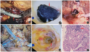 经过积极术前准备,在患者签署“医院应对COVID-19疫情手术筛查表”、承诺非疫区接触,做好手术房间、用品、人员二级防护措施(防护服、外科口罩、护目镜、工作帽、鞋套),并保守治疗3 d不见好转的情况下,于2020年1月31日按指定防护路线转运至手术室,在特定的独立负压手术间行急诊腹腔镜探查,术中见胆囊积脓、胆总管内脓性胆汁,予以行腹腔镜胆囊切除、经胆囊管胆总管探查(laparoscopic transcystic common bile duct exploration,LTCBDE)、腹腔引流术[2],术中经胆道镜取出胆总管结石3枚(直径6~8 mm),取石后见胆囊管扩张(直径8 mm),予以置入一根12号硅胶引流管后间断缝合关闭胆囊管残端(图2a~e),术毕将病理标本、医疗废物按二级防护处置。术后带气管插管沿指定防护路线送回普外科原单间隔离病房,呼吸机辅助治疗16 h后顺利脱机[3],继续给予加强抗感染、保肝、抑酸、抑制消化液分泌、营养支持治疗。术后第1天肝功能总胆红素306.61 μmol/L,直接胆红素172.97 μmol/L,丙氨酸氨基转移酶67 U/L。术后第3天血常规白细胞9.4×109/L,中性粒细胞比例89.3%,血高敏C反应蛋白53.92 mg/L,肝功能总胆红素269.81 μmol/L,直接胆红素140.80 μmol/L,丙氨酸氨基转移酶48 U/L,血CA19-9 94.1 U/ml,开始流质饮食。术后7 d复查胸部CT显示:双肺支气管炎伴散在肺炎、双下肺局部肺组织膨胀不全,双侧胸腔积液,继续抗感染治疗。术后病理报告:胆囊壁慢性炎症急性发作(图2f)。术后14 d胸部CT、各项检验指标基本恢复正常,经胆囊管引流管造影显示胆总管下端通畅,肝内外胆管未见残余结石和扩张,解除隔离病房观察,带胆囊管引流管出院,备术后6周拔除引流管。