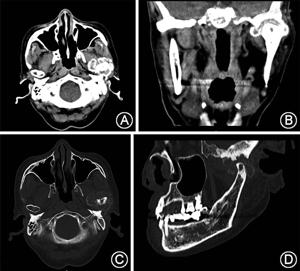 1.病例1:患者女性,72岁,2020年8月因“左耳前肿痛10天余”入院。10余天前患者出现左耳前肿胀并伴有剧烈疼痛,于外院抗炎治疗后自觉肿胀和疼痛稍缓解。既往有糖尿病、高血压病史20年,脑梗死病史8年。无颌面部创伤史。