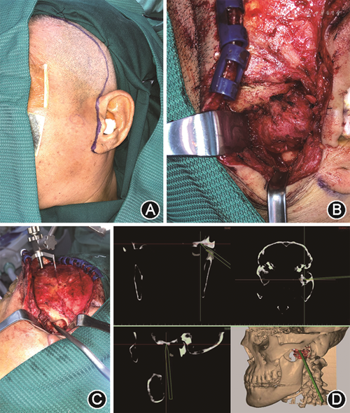 TC的治疗很大程度上取决于其分类,同时需要根据病变的部位、大小和患者的全身状态进行调整。当原发性TC出现疼痛、感染和颞下颌关节功能障碍时,一般考虑行手术治疗[21]。考虑到该病具有复发性,可能需要进行多次手术。其中正常磷血症型TC比高磷血症型TC的术后复发率低,这与两者全身的血清磷水平不同有关。因此高磷血症型TC还可以考虑限制钙磷饮食,口服氢氧化铝以减少机体磷酸盐的产生,在用餐时同时服用磷酸盐结合剂等治疗方法[22]。病例1因为病变位置累及髁突,因此采用了将病变组织和髁突同时切除的较为彻底的手术方法,但该部位紧邻颅底等重要解剖结构,且周围血管、神经丰富,采用计算机导航技术可为术者的手术操作提供更好的视野和更精确的定位,降低了损伤髁突周围和颅底重要结构的风险。