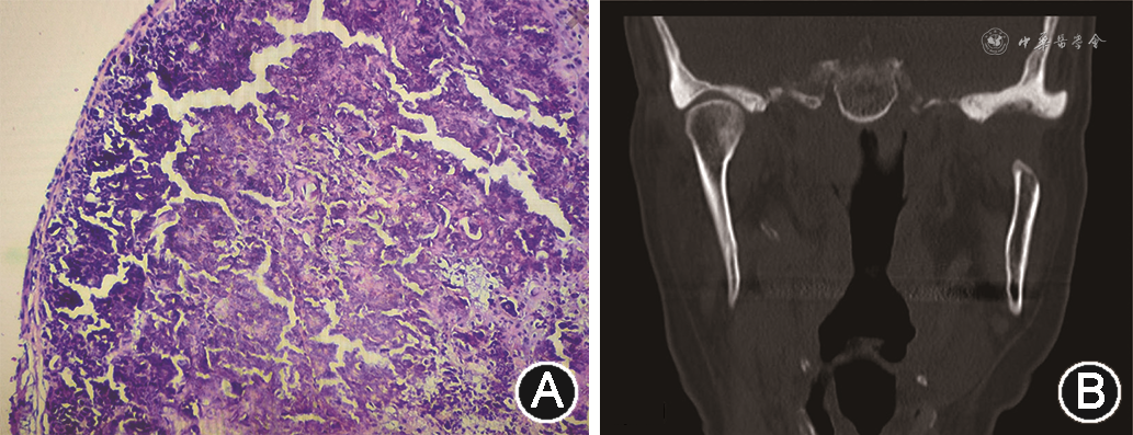 (2)影像学检查:见图1。螺旋CT提示左侧髁突膨大,骨质致密硬化,其内见不规则腔状吸收破坏,边缘不整。髁突周围团块状混杂密度影,周缘呈不规则环状、花边状高密度影。