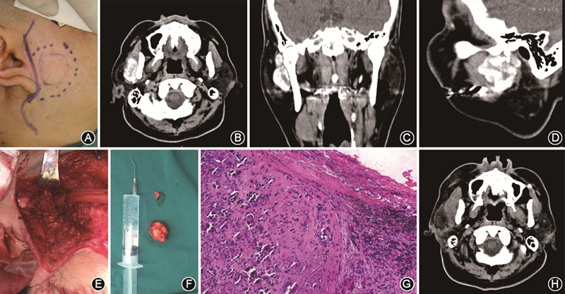 (5)治疗过程:术中做耳前S形切口,将咬肌和腮腺一并向上翻起,在其深面暴露出肿物,包膜完整,质地中等偏硬,有一蒂与髁突关节囊相连。将肿物、蒂部和部分关节囊一并切除(图4E)。充分止血冲洗后关闭术创(图4F)。病理诊断为:右颞下颌关节区TC(图4G)。患者术后1周出院时术创皮肤对位良好,无明显红肿及渗出,咬合关系正常,轻度张口受限,右眼轻度闭合不全,右额纹变浅,右侧嘴角稍向左偏斜。