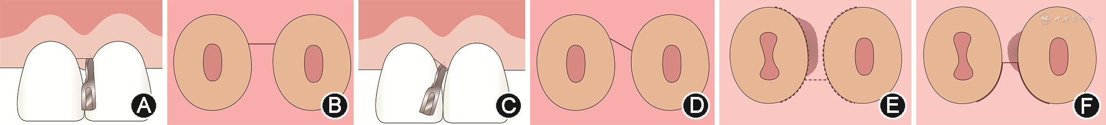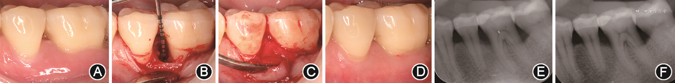 面观,自患牙颊侧轴角切入至邻牙接近邻面中线的位置(图1D)。以此将整个龈乳头分为包含龈乳头顶部且较大的腭侧瓣和包含较小部分龈乳头的颊侧瓣,采用该方法可较大程度改善龈乳头血供,降低移植材料暴露的概率,从而获得更多的牙周新附着和骨再生。已有文献显示,采用SPPF可获得(4.9±1.8)mm的CAL增加量,67%以上的病例始终维持一期愈合[35]。