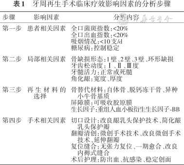 牙周炎可致牙周组织破坏、牙齿松动和脱落,严重影响患者生活质量。牙周再生手术是修复牙周组织缺损的重要治疗手段,也是目前牙周临床和基础研究的重点。全面了解影响牙周再生手术疗效的相关因素能增强临床医师的牙周治疗理念,增加治疗效果的可预期性,提升临床综合诊疗水平。本文阐述牙周再生的基本原则和牙周创面愈合的要点,从患者因素、局部因素、手术因素以及再生材料选择方面全方位剖析影响牙周再生手术临床效果的各项要素,以期对临床医师有所帮助。