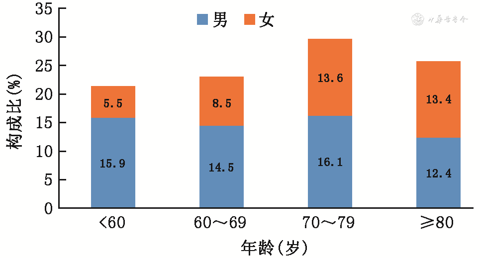 (2)病因、合并症及临床特点:住院心衰患者的主要病因中,冠心病占59.9%、扩张型心肌病占12.2%,瓣膜性心脏病占9.3%。常见合并症依次为高血压(58.3%)、心房颤动/扑动(34.8%)、糖尿病(27.4%)、贫血(25.3%)、慢性肾脏病(12.8%)、卒中(13.5%)、低钠血症(9.8%)、慢性阻塞性肺疾病(8.7%)、外周动脉疾病(8.2%)和甲状腺功能异常(5.0%)。合并症≥3个的患者占47.0%,<60岁、60~69岁、70~79岁、≥80岁的患者中合并症≥3个的比例分别为26.1%、42.9%、53.3%、61.3%。估算的肾小球滤过率(estimated glomerular filtration rate,eGFR)<30 ml·min-1·1.73 m-2者占 8.6%,30~60 ml·min-1·1.73 m-2者占27.6%。合并低钾血症(血钾<3.5 mmol/L)和高钾血症(血钾>5 mmol/L)者占比分别为8.4%和4.5%,合并低钠血症(血钠<135 mmol/L)者占比为9.8%。24.8%的住院心衰患者近1年内曾因心衰住院