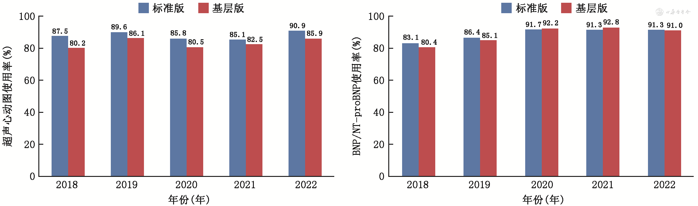 2. BNP/NT-proBNP使用率:BNP/NT-proBNP在心衰诊断中具有较强的普适性及良好的敏感度和特异度,在各国指南中均被推荐用于心衰筛查、诊断和鉴别诊断、病情严重程度及预后评估,且住院期间动态监测BNP/NT-proBNP有助于评估心衰患者出院后的心血管事件风险。各中心诊断心衰时使用BNP/NT-proBNP的比例呈逐渐上升趋势,2022年标准版心衰中心使用率为91.3%,基层版心衰中心为91.0%,较2018年的83.1%和80.4%均有提高,且基层版心衰中心与标准版心衰中心使用BNP/NT-proBNP的比率接近,详见图4。提示BNP/NT-proBNP在各级心衰中心均得到了很好的应用,这有助于提高心衰诊断的准确率。