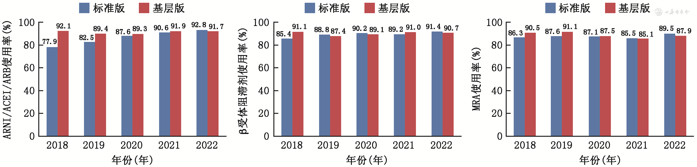 ARNI/ACEI/ARB和β受体阻滞剂的使用率接近欧美等发达国家[9, 10, 11],这些药物已被证实能降低HFrEF患者死亡率[12, 13],使用率的稳步提升必将给患者带来更多获益。