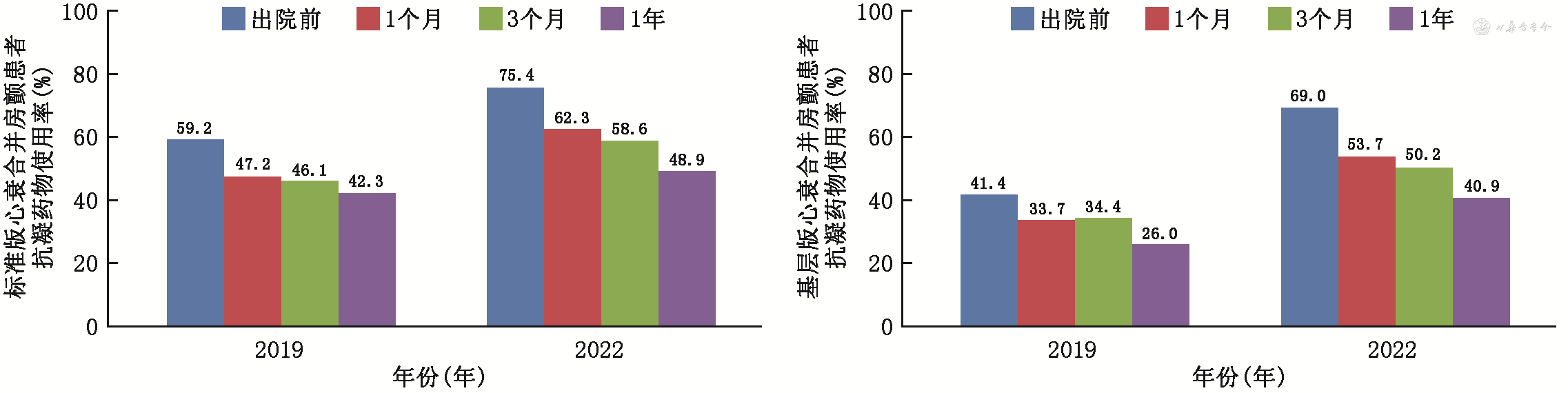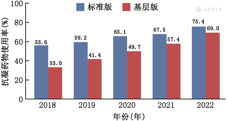 4.合并心房颤动的心衰患者出院前抗凝药物使用率:心房颤动常与心衰共存,心衰中心患者合并心房颤动的比例高达34.8%。卒中或栓塞是心房颤动最主要的并发症,研究显示抗凝治疗可显著降低卒中风险[16, 17]。相关指南指出即使没有其他危险因素,心房颤动合并心衰即可考虑长期抗凝治疗。因此,心衰中心医疗质量控制指标纳入了合并房颤的心衰患者出院前抗凝药物使用率,计算时除外了CHA2DS2-VASc评分仅1分的女性以及存在抗凝禁忌证的患者。近5年,合并心房颤动的心衰患者出院前抗凝药物使用率明显升高,标准版心衰中心由2018年的55.6%提高到2022年的75.4%,基层版心衰中心由2019年的41.4%提高到2022年的69.0%,但仍低于标准版心衰中心。见图6。