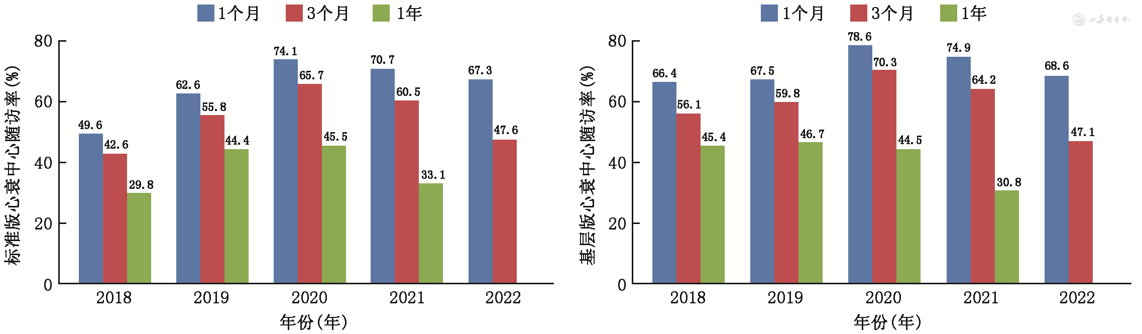 总体而言,近年来心衰患者出院后随访率呈升高趋势。标准版心衰中心出院后1、3个月随访率在2021年时分别达到70.7%和60.5%,1年随访率在2020年达到45.5%;基层版心衰中心出院后1、3个月随访率在2021年分别达到74.9%和64.2%,1年随访率在2020年达到44.5%。但值得注意的是,随着出院时间延长,随访率不断下降,1年随访率明显低于1和3个月时的随访率,且1年随访率不到50%,此外受疫情等多种因素影响,2021、2022年随访率有所下降,总之在心衰患者出院后随访方面仍有很大的提升空间。见图7。