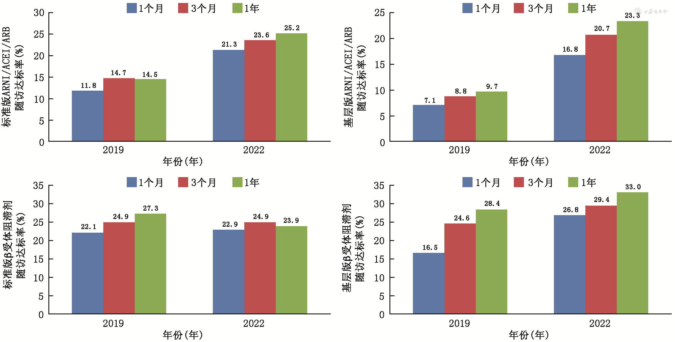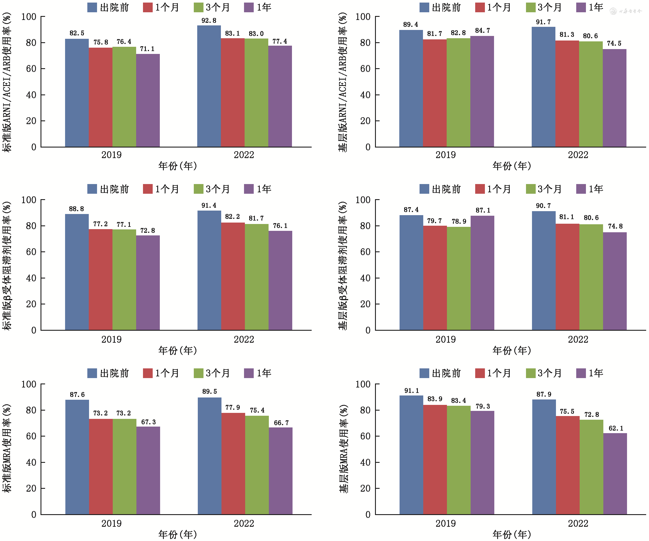 标准版心衰中心出院后1、3个月和1年ARNI/ACEI/ARB使用率分别从2019年的75.8%、76.4%和71.1%升高至2022年的83.1%、83.0%和77.4%,β受体阻滞剂使用率从2019年的77.2%、77.1%和72.8%升高至2022年的82.2%、81.7%和76.1%,MRA使用率从2019年的73.2%、73.2%和67.3%变化至2022年的77.9%、75.4%和66.7%。基层版心衰中心随访期间药物使用率和变化趋势与标准版相近。值得注意的是,无论标准版还是基层版心衰中心,随出院时间延长药物使用率均呈现下降趋势,提示遵循指南规范治疗的长期依从性有待进一步提高。见图8。